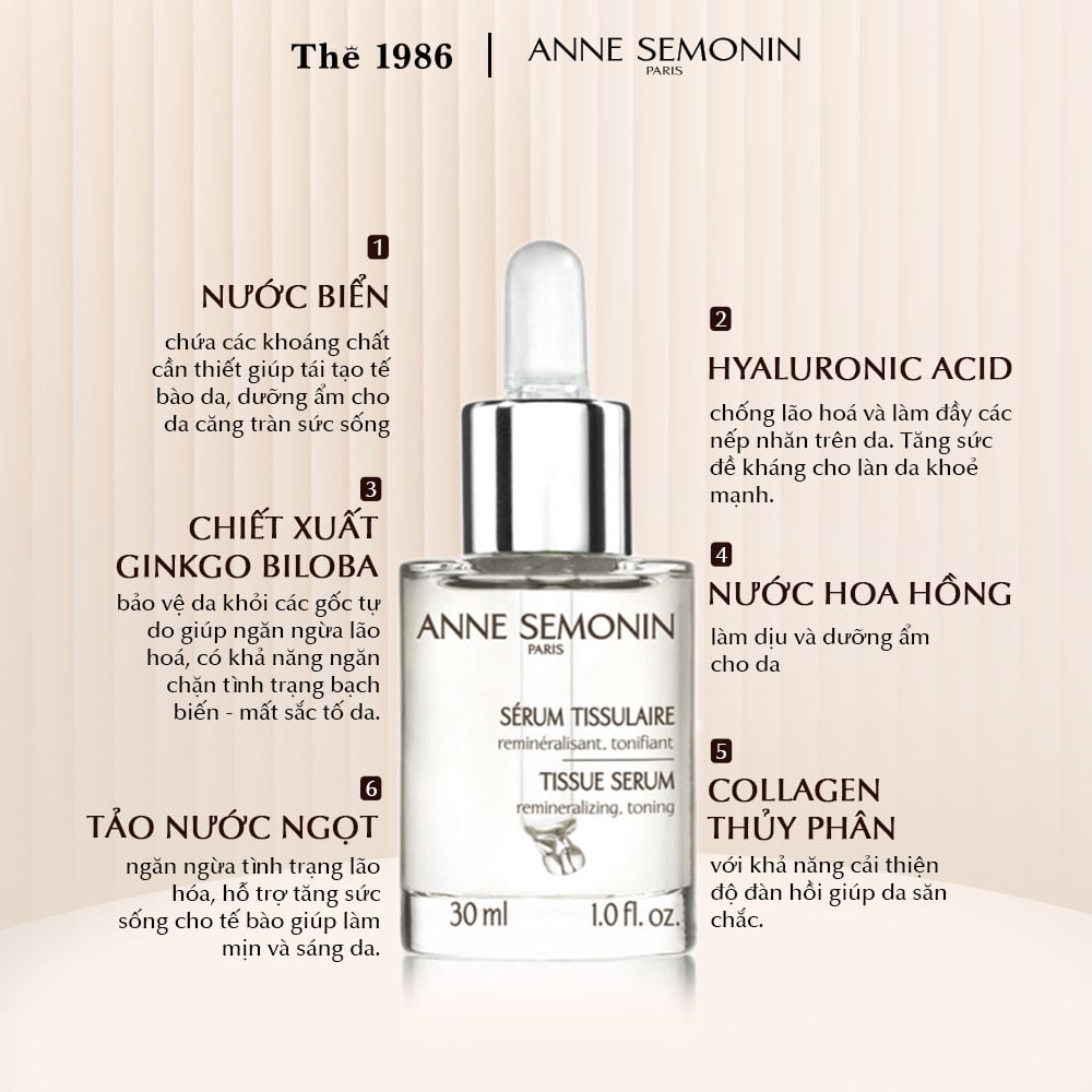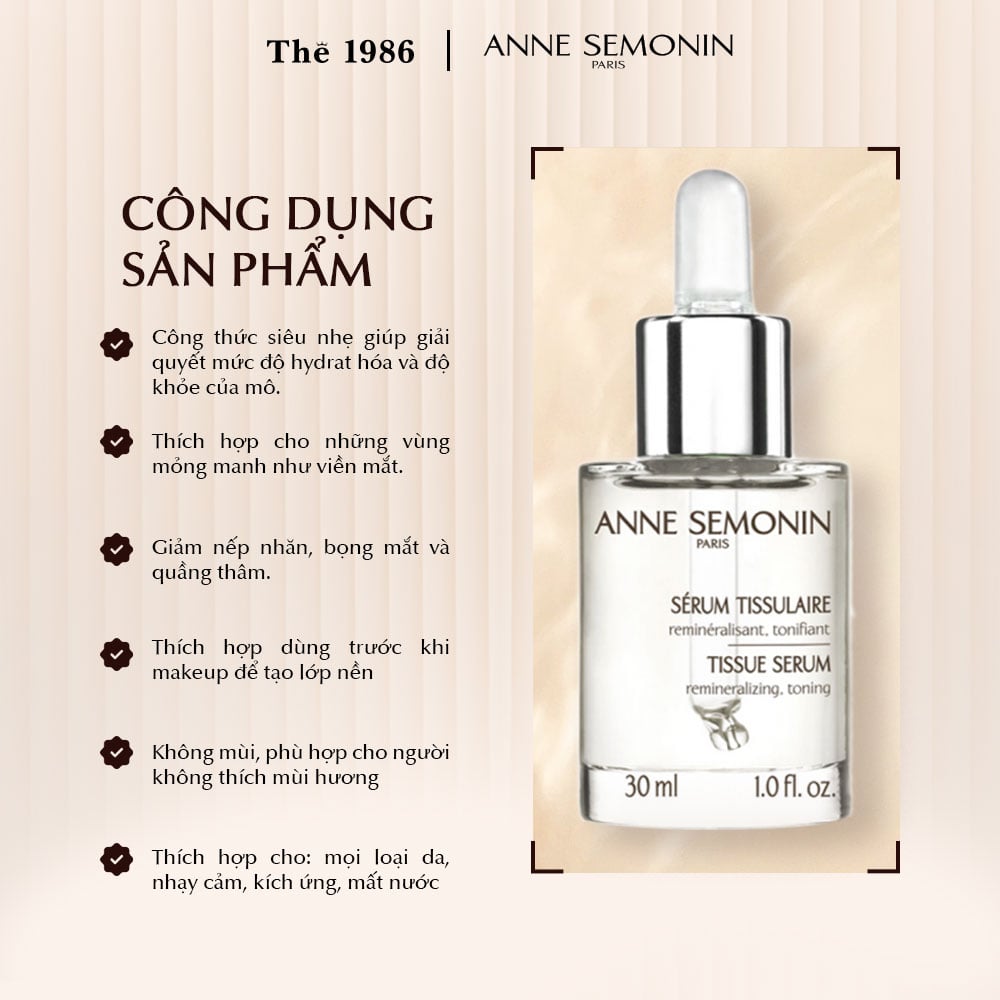 Anne Semonin Tissue Serum - Serum cho da không đều màu, chuyên khai thác các công dụng của khoáng chất có nguồn gốc từ biển để làm trắng sáng da, cải thiện tình trạng đồi mồi, sạm, nám giúp da sáng và đều màu hơn.